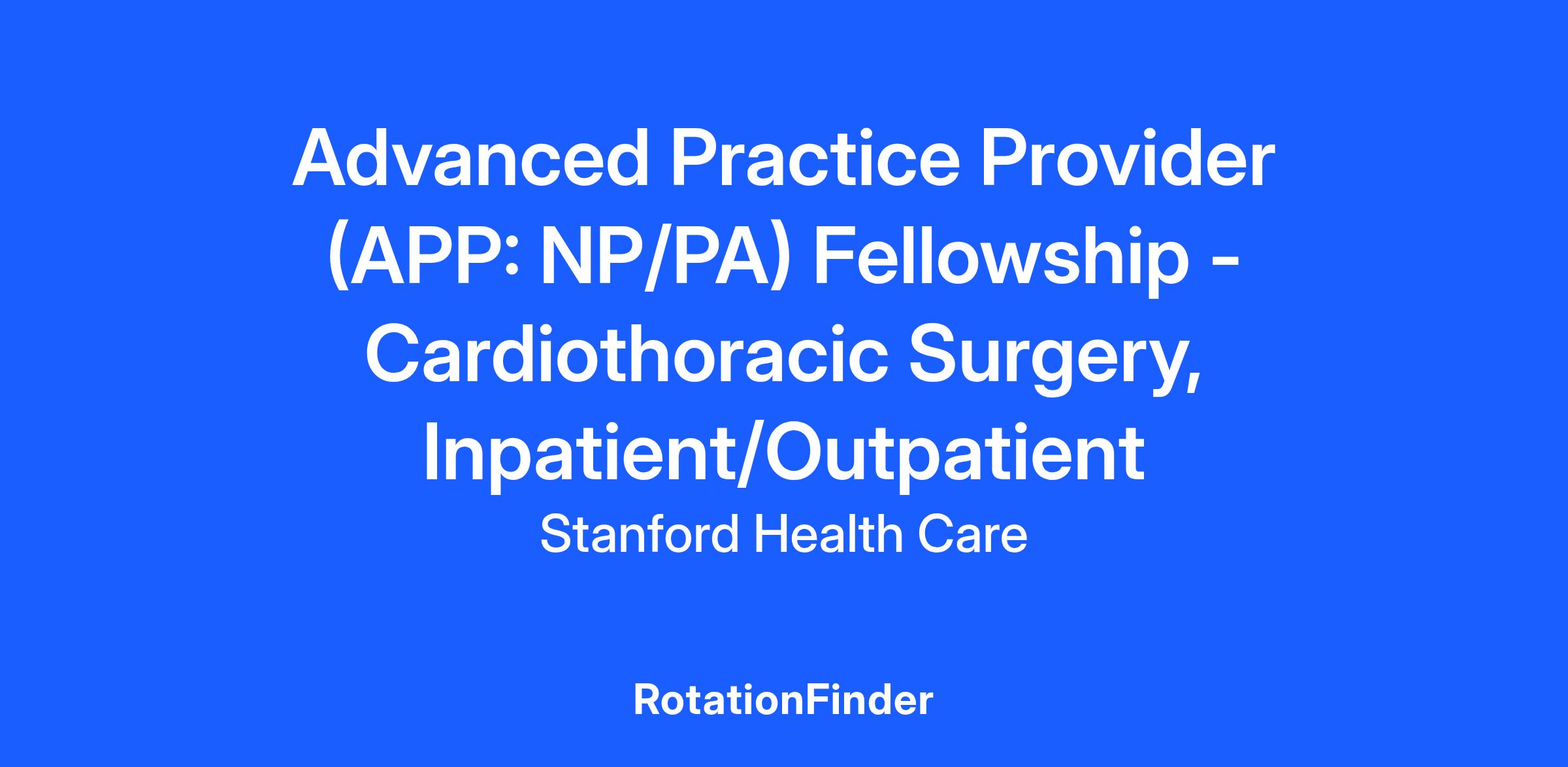 The Center for Advanced Practice at Stanford Health Care is accepting applications for the 2026-2027 Advanced Practice Provider (APP) Fellowship. The APP Fellowship Program prepares postgraduates in the core domains of transition to practice, professionalism and specialty competencies. The 12-month program includes didactic and practice-based learning in various settings. The clinical transition to practice program is for newly graduated APPs with less than one year of advanced practice experience. More information can be found at https://careers.stanfordhealthcare.org/us/en/advanced-practice-provider-fellowship.