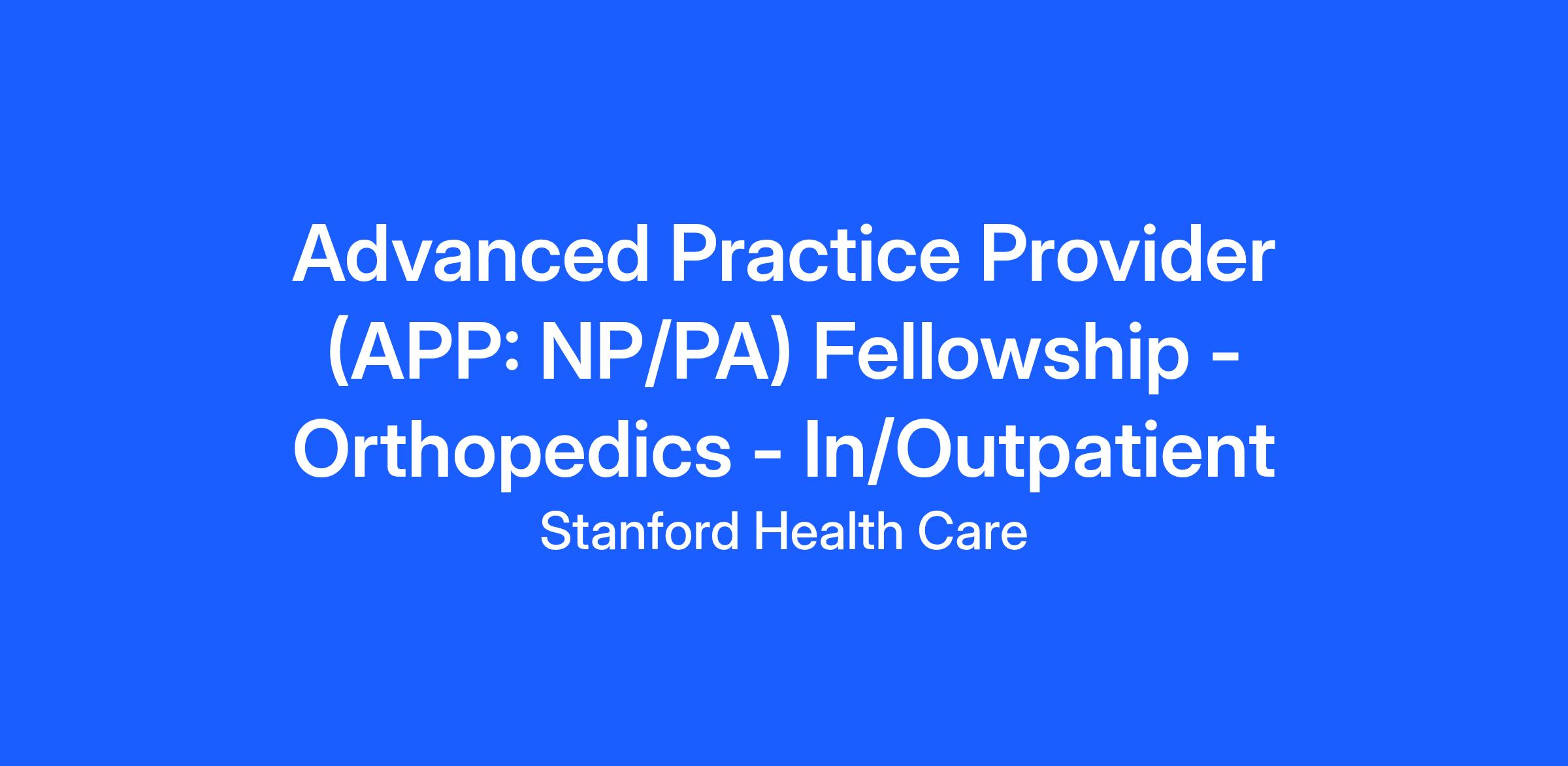 The Center for Advanced Practice at Stanford Health Care is accepting applications for the 2026-2027 Advanced Practice Provider (APP) Fellowship. The APP Fellowship Program prepares postgraduates in the core domains of transition to practice, professionalism and specialty competencies. The 12-month program includes didactic and practice-based learning in various settings. The clinical transition to practice program is for newly graduated APPs with less than one year of advanced practice experience. More information can be found at https://careers.stanfordhealthcare.org/us/en/advanced-practice-provider-fellowship.