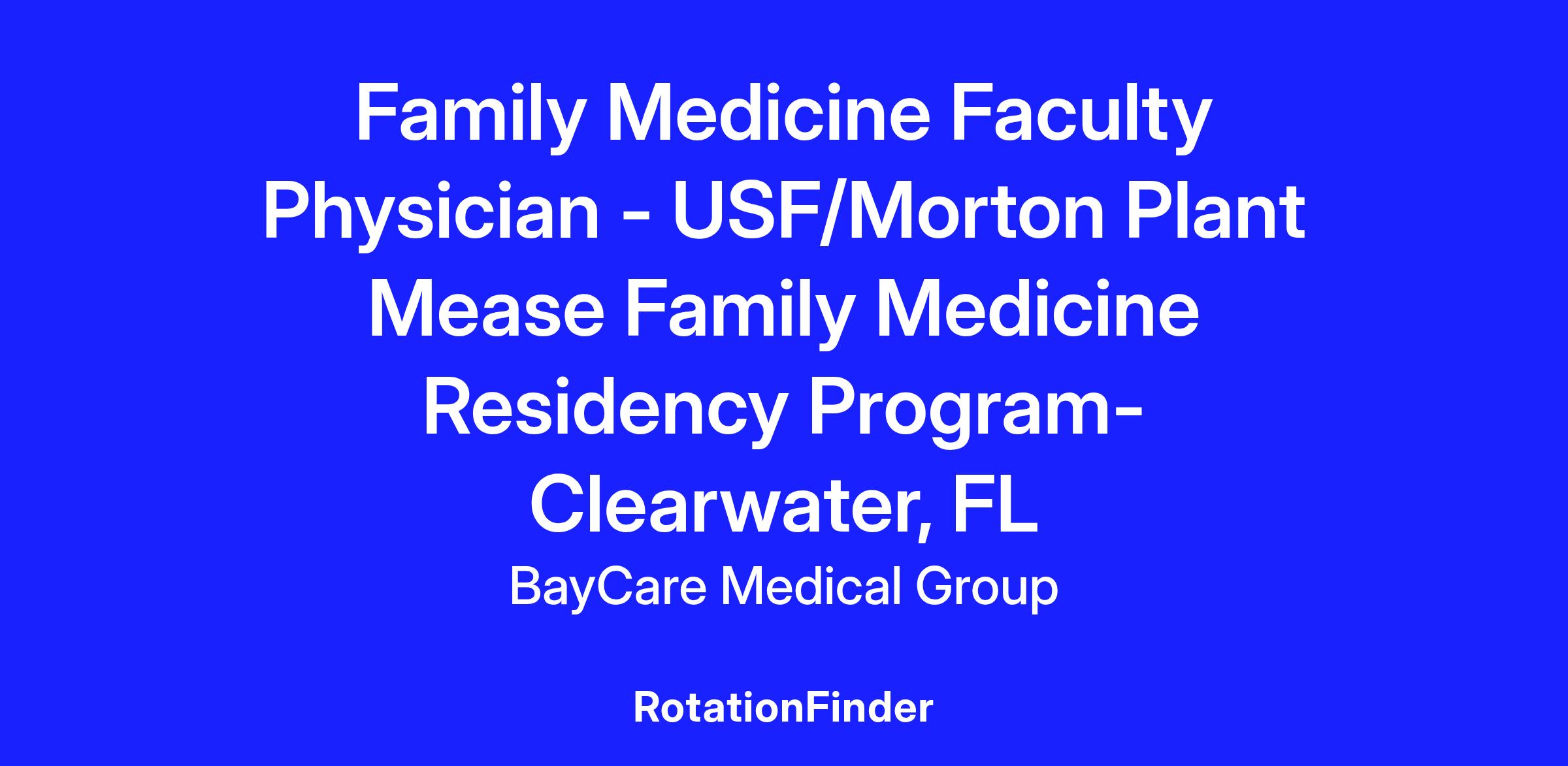 BayCare Health System is committed to the communities we serve by training the next generation of physicians through our teaching hospitals, Morton Plant Hospital and Winter Haven Hospital. Our residency programs are a blend of quality hospitals and clinic facilities. We are seeking a board certified/board eligible Family Medicine physician for a core facility position in our residency program in Clearwater, Florida. See our website to learn more.