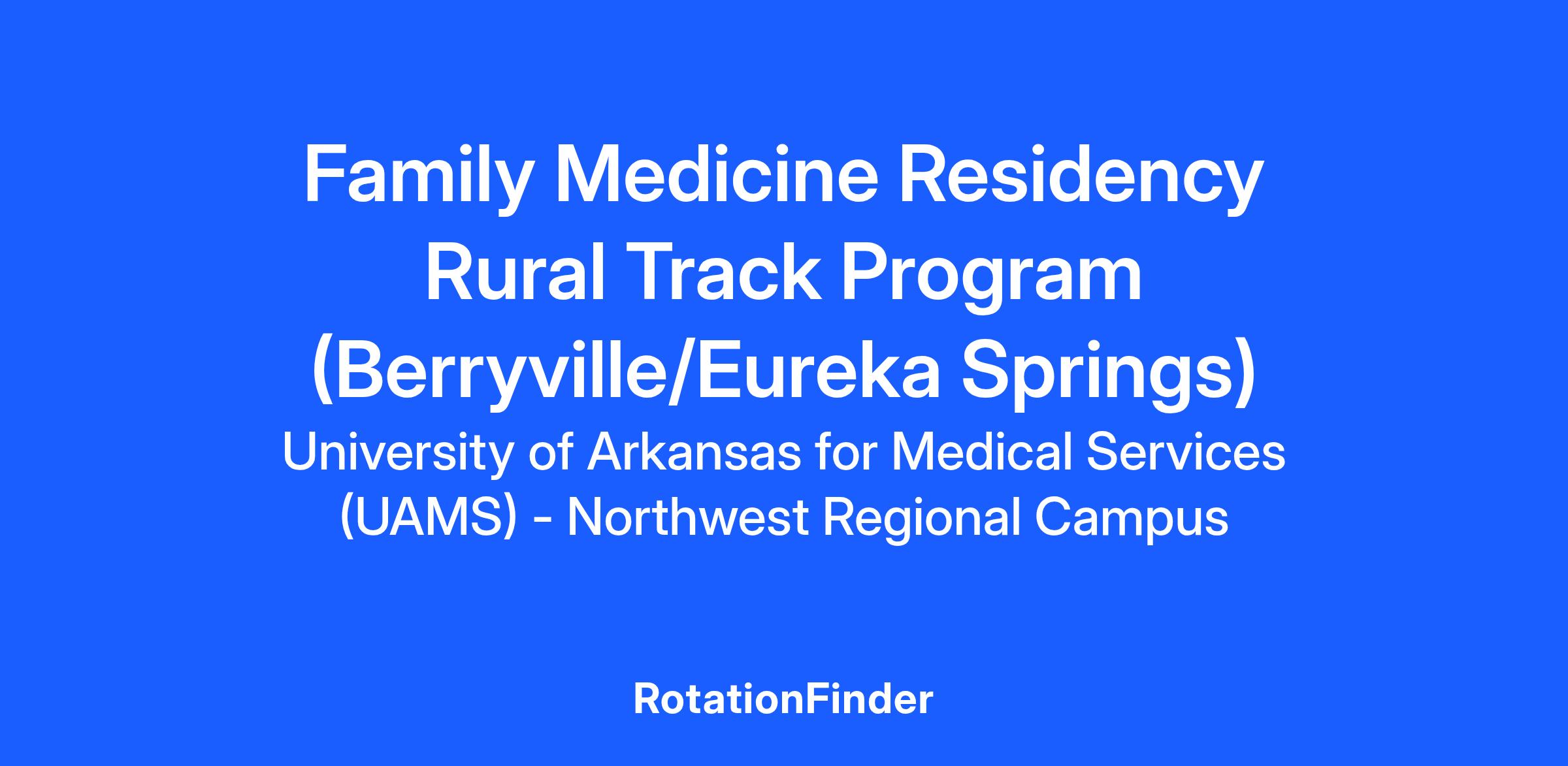 The UAMS Northwest Family Medicine Rural Training Program is located in Fayetteville, Arkansas for the PGY-1 year and in nearby Carroll, Madison, and Boone Counties for PGY-2 and PGY-3. This rural training program was established in 2022 as a new community-based program through a partnership with UAMS, Washington Regional Medical Center, and Mercy. This family medicine residency program is designed to train residents in clinical reasoning, critical thinking, research, and providing the full-scope of family practice services to meet the health care needs of rural communities.
