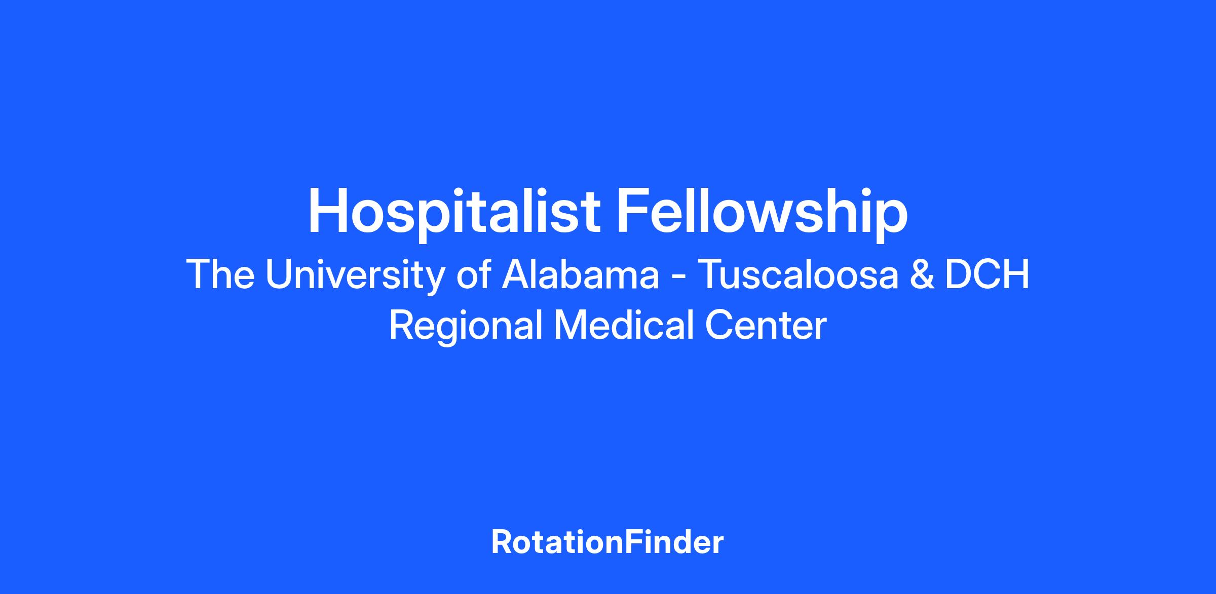 The University Hospitalist Fellowship is a year-long fellowship for family medicine physicians seeking experience practicing medicine within hospitals, caring for patients from the time they are admitted to the time they are discharged. The fellowship offers one-on-one supervision from a Capstone Hospitalist Service attending physician for The University of Alabama College of Community Health Sciences, as well as the Hospitalist Fellowship director. The fellowship is housed at DCH Regional Medical Center in Tuscaloosa, a tertiary-care facility with 583 beds and one that offers a broad array of specialty units and advanced services, including cancer, cardiology, robotic and minimally invasive surgery, critical care pulmonology, gastroenterology, nephrology and the region’s most advanced trauma center. The University Hospitalist Fellowship is one of only a few nationwide that includes a rural focus and the first such program in the country, founded in 2006.