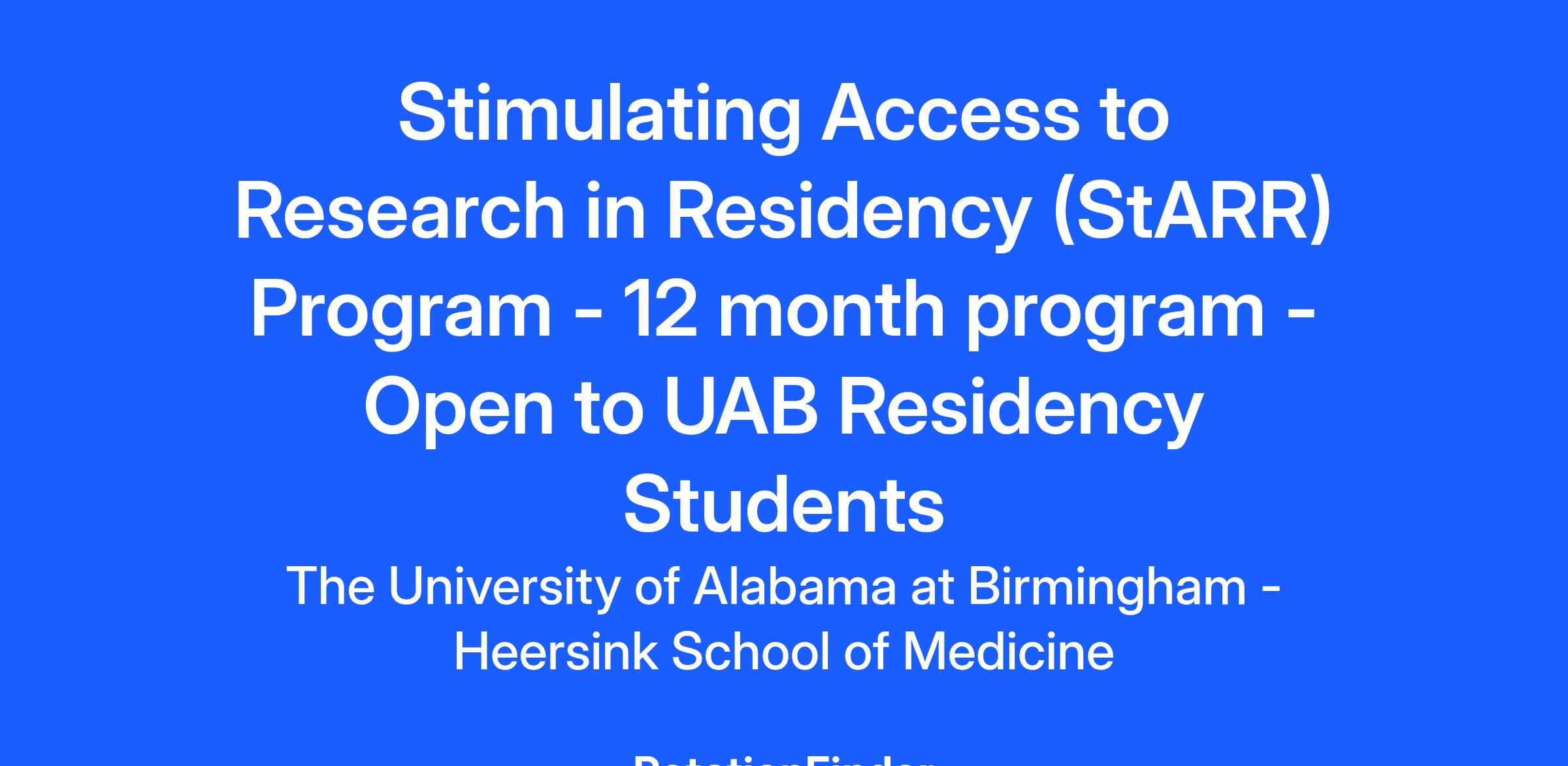 The UAB Stimulating Access to Research in Residency (StARR) Program, funded by an NIH NIAID R38 award, supports mentored research and career development activities for residents from UAB’s Internal Medicine, Pediatrics, Pathology, Surgery, and OB/GYN Residency Programs. Each year, up to 4 residents from those residency programs will be selected for UAB StARR based on their StARR application merits and will complete a 12-month program that includes: 1) research mentored by a UAB-affiliated faculty preceptor with an excellent mentoring track record and funding, and 2) career development activities leading to core competencies in research methodology, responsible conduct of research, communication of findings, scientific writing, and team science.