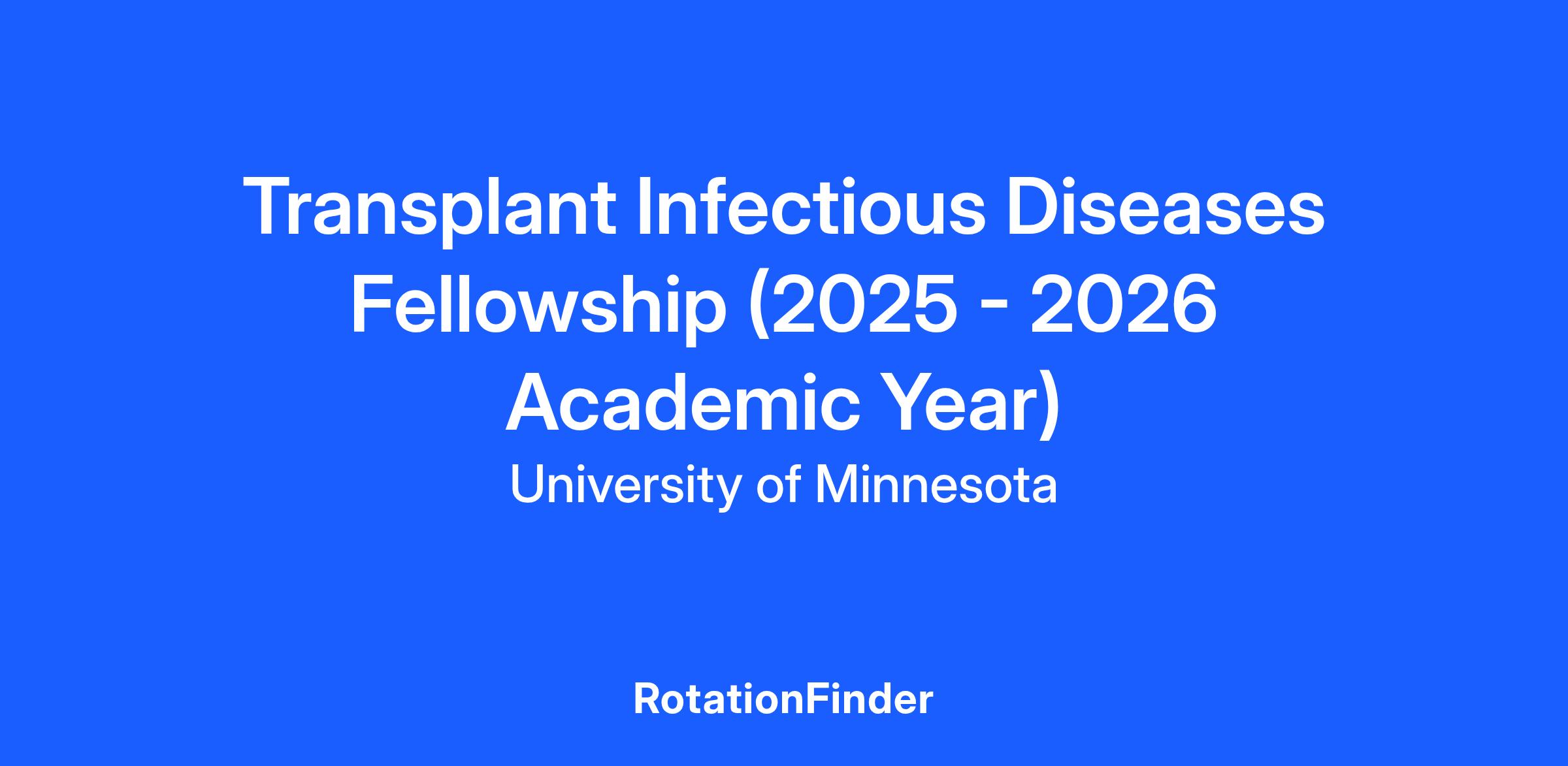 The University of Minnesota offers a one-year Transplant Infectious Diseases (TID) Fellowship position. The focus of this year is to provide excellent clinical training in TID with exposure to solid organ transplantation (SOT), including heart, lung, liver, kidney and kidney-pancreas transplants as well as hematopoietic cell transplantation (HCT). Program leadership works closely with the trainee to individualize clinical and research experiences that are reflective of the trainee's interests. Training occurs in a collaborative and supportive environment.